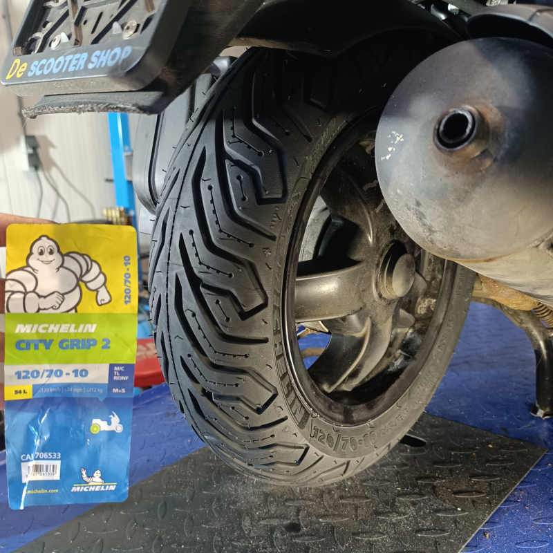 All-season tire "City Grip 2" from Michelin in size 120/70-10. Suitable for the rear wheel of a Piaggio Zip, among others.